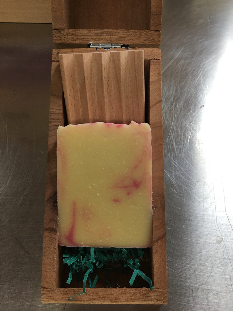 This a wooden gift box that is made a one-of-a kind by what you choose to put inside of it. This spacious box will hold a washcloth, a soap dish and a bar of soap.